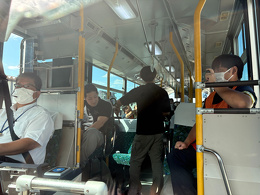 バス走行中にエンジン付近から火災が発生した想定で避難訓練を実施しました。運転手はハザードを点灯し、乗客の避難及び避難場所を指示。119番へ場所(キロポスト等)と状況を報告し、負傷者の有無を確認しました。