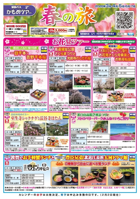 チラシ閲覧 2026/02/05 春の旅 出発日2026年3月~2026年7月 desktop_windowsWEBで見る file_downloadPDFで見る 2025/11/17 忘年から新春の旅 出発日2025年12月~2026年3月 desktop_windowsWEBで見る file_downloadPDFで見る 2025/08/28 秋の旅 出発日2025年9月~2026年2月 desktop_windowsWEBで見る file_downloadPDFで見る
