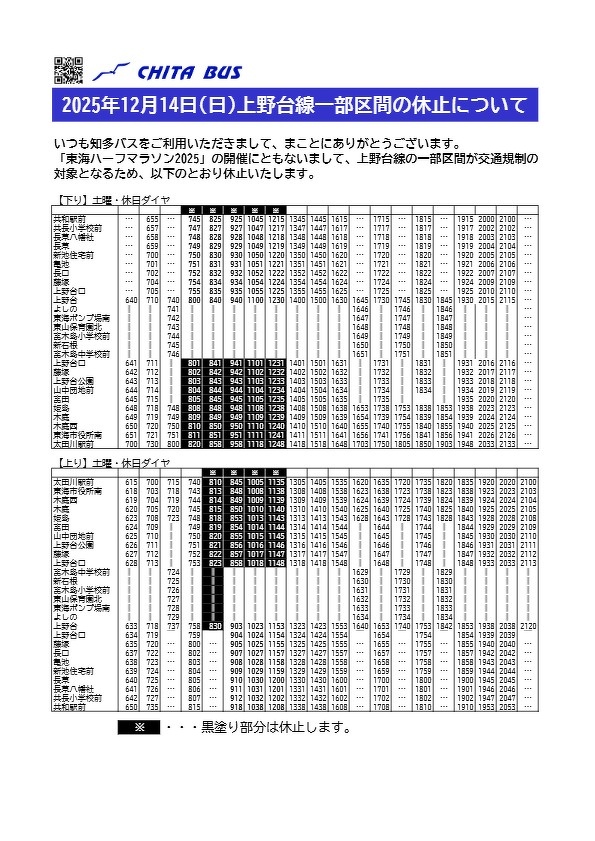 「東海ハーフマラソン2025」の開催にともないまして、上野台線の一部区間が交通規制の対象となるため、以下のとおり休止いたします。