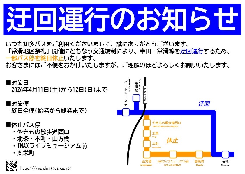 2026/03/10NEW路線バス 4/11、12日 常滑地区祭礼による一部バス停休止、終日迂回運行について 2026年度 常滑地区祭礼行事概要 1.日程:2026年4月11日(土)、12日(日)の2日間 2.概要:上記日程の両日、半田・常滑線は、迂回経路(青線)で運行致します。休止経路(黄線)は運行しません。お間違えのないようご注意ください。 3.休止バス停 ・やきもの散歩道西口 ・北条 ・本町 ・山方橋 ・INAXライブミュージアム前 ・奥栄町 ご不明な点等ございましたら 知多乗合(株)半田営業所 0569-21-5234 までご連絡願います。