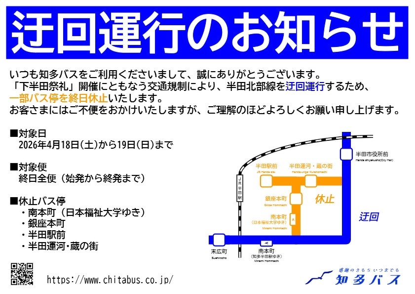 2026/03/17NEW路線バス 4/18、19日 下半田祭礼による一部バス停休止、終日迂回運行について 2026年度 下半田祭礼行事概要 1.日程:2026年4月18日(土)、19日(日)の2日間 2.概要:上記日程の両日、半田北部線は、迂回経路(青線)で運行致します。休止経路(黄線)は運行しません。お間違えのないようご注意ください。 3.休止バス停 ・南本町(日本福祉大学ゆき) ・銀座本町 ・半田駅前 ・半田運河・蔵の街 ご不明な点等ございましたら 知多乗合(株)半田営業所 0569-21-5234 までご連絡願います。